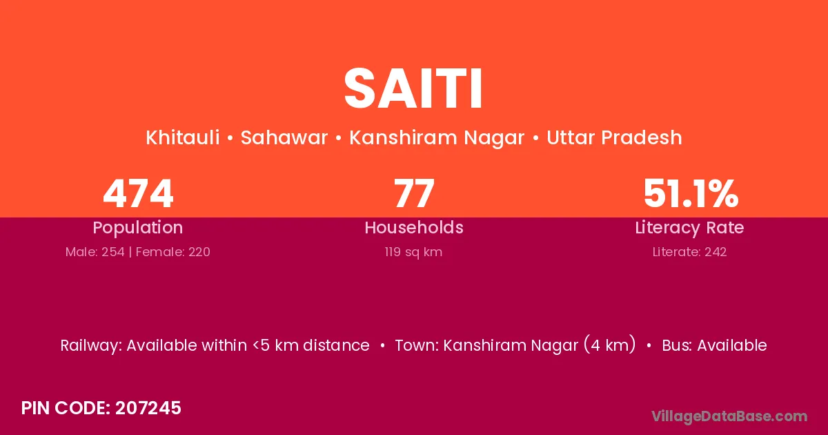 Kanshiram Nagar (4 km) is the nearest town to Saiti village for major economic activities and is located approximately 4 km away.
