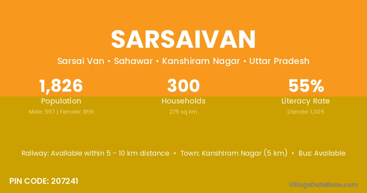Kanshiram Nagar (5 km) is the nearest town to Sarsaivan village for major economic activities and is located approximately 5 km away.