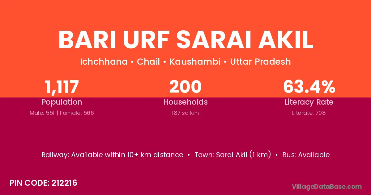 Bari Urf Sarai Akil village has a total population of 1,117 people, of which 551 are males and 566 are females.
