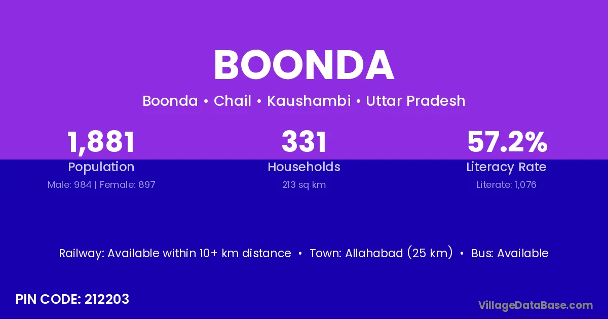 Allahabad (25 km) is the nearest town to Boonda village for major economic activities and is located approximately 25 km away.