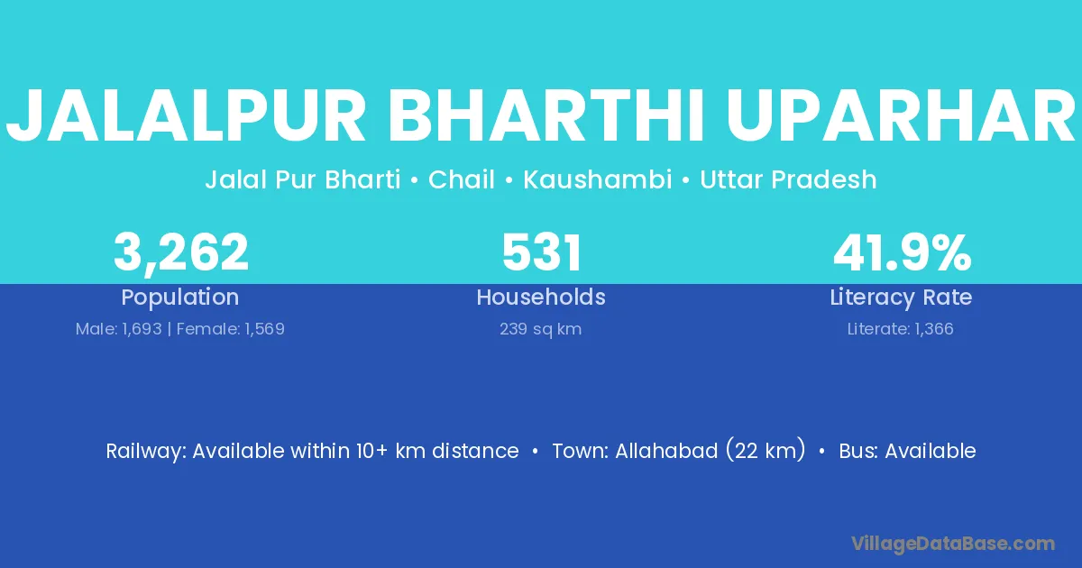 Allahabad (22 km) is the nearest town to Jalalpur Bharthi Uparhar village for major economic activities and is located approximately 22 km away.