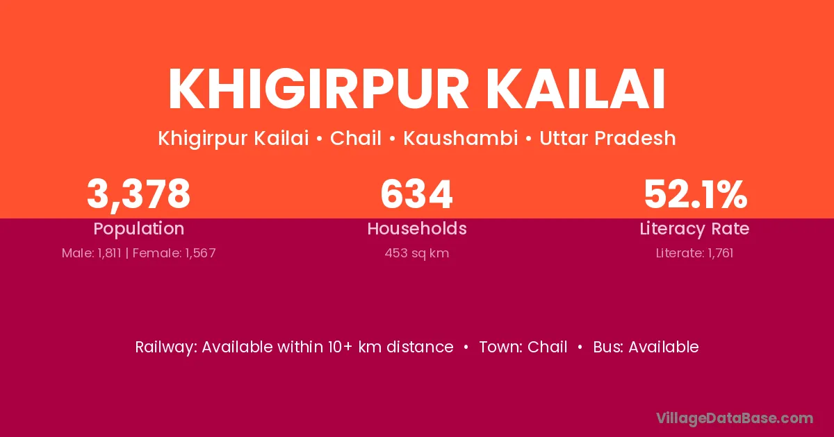 Khigirpur Kailai village has a total population of 3,378 people, of which 1,811 are males and 1,567 are females.