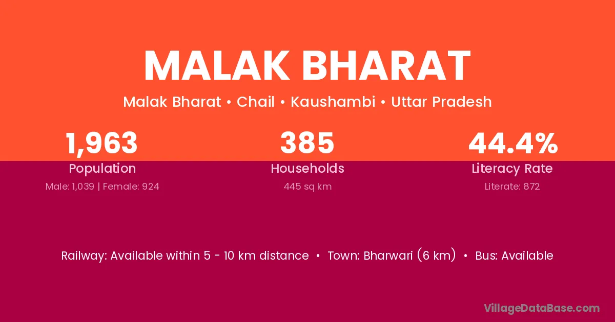 Bharwari (6 km) is the nearest town to Malak Bharat village for major economic activities and is located approximately 6 km away.