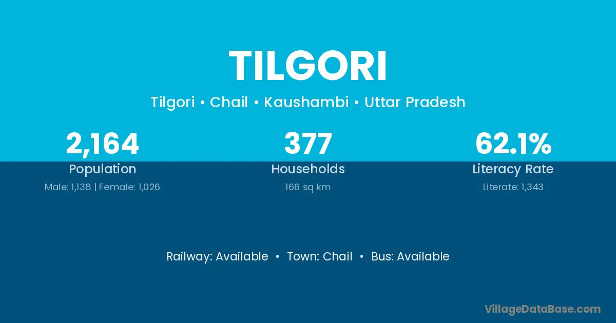 Tilgori village has a total population of 2,164 people, of which 1,138 are males and 1,026 are females.