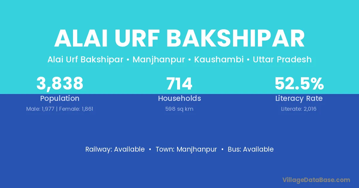 Alai Urf Bakshipar village has a total population of 3,838 people, of which 1,977 are males and 1,861 are females.