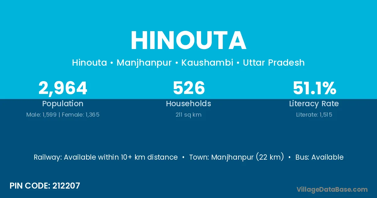 Manjhanpur (22 km) is the nearest town to Hinouta village for major economic activities and is located approximately 22 km away.