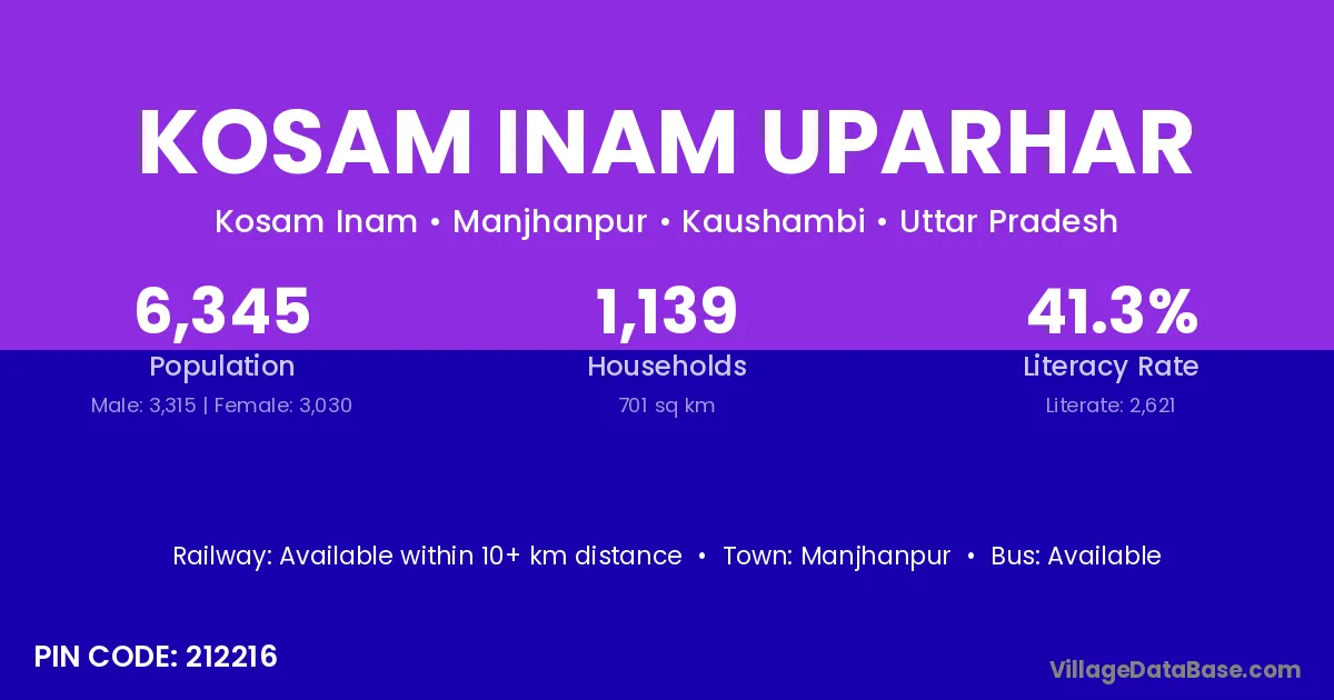 Kosam Inam Uparhar village has a total population of 6,345 people, of which 3,315 are males and 3,030 are females.
