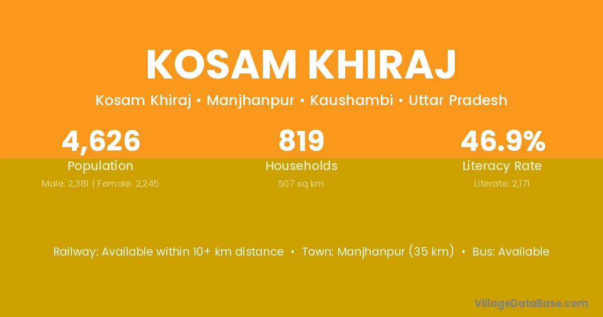 Manjhanpur (35 km) is the nearest town to Kosam Khiraj village for major economic activities and is located approximately 35 km away.