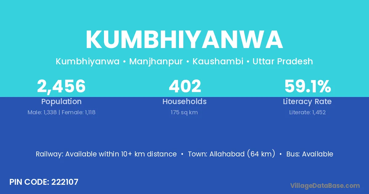 Allahabad (64 km) is the nearest town to Kumbhiyanwa village for major economic activities and is located approximately 64 km away.