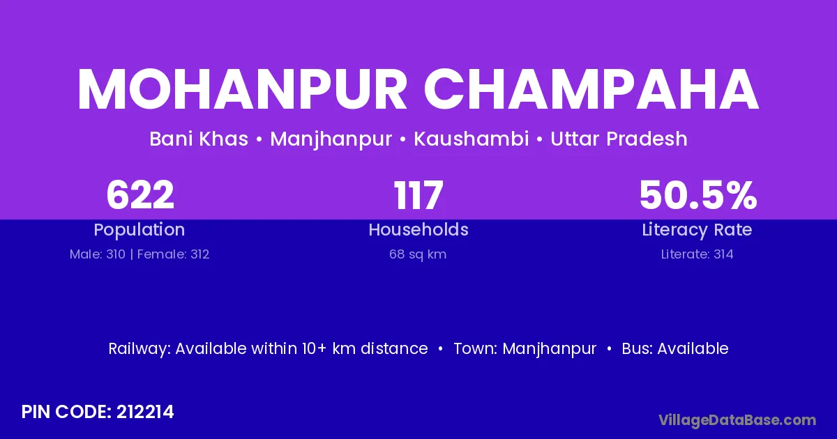 Mohanpur Champaha village has a total population of 622 people, of which 310 are males and 312 are females.