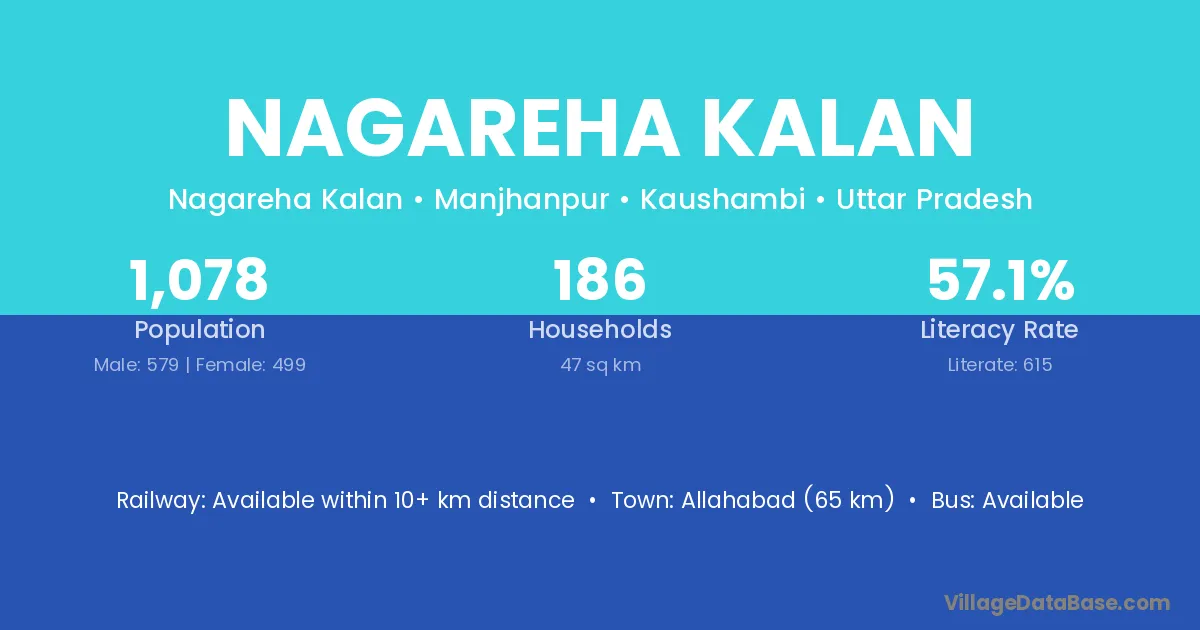 Allahabad (65 km) is the nearest town to Nagareha Kalan village for major economic activities and is located approximately 65 km away.
