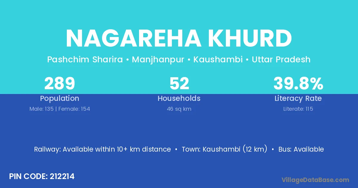 Kaushambi (12 km) is the nearest town to Nagareha Khurd village for major economic activities and is located approximately 12 km away.