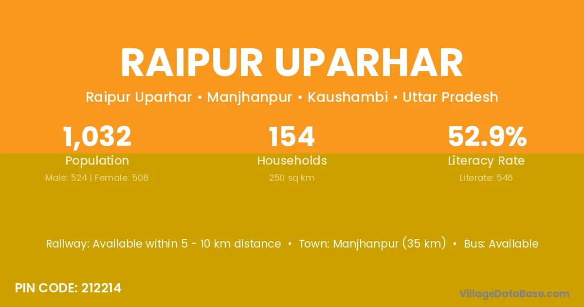 Manjhanpur (35 km) is the nearest town to Raipur Uparhar village for major economic activities and is located approximately 35 km away.