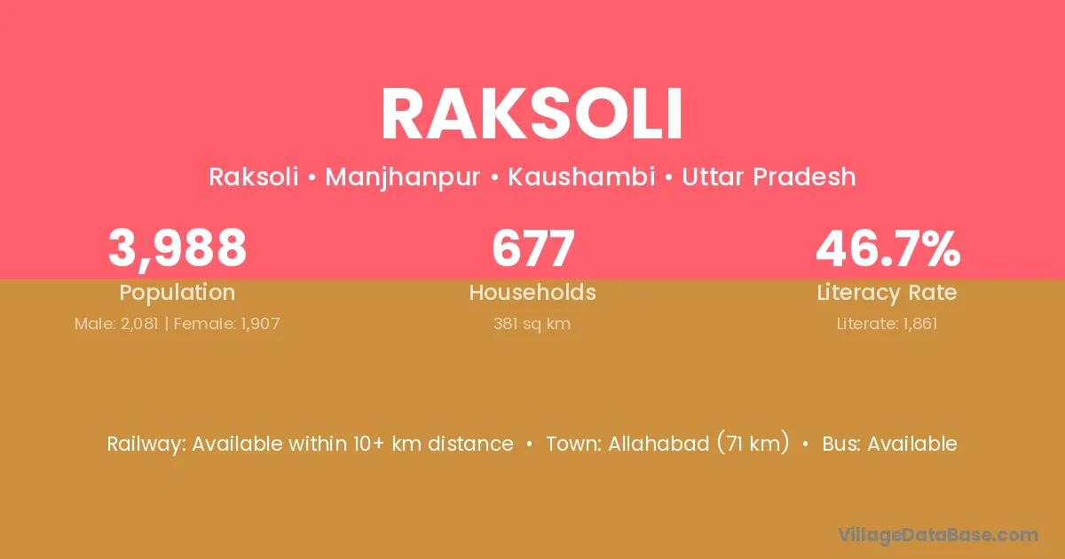 Allahabad (71 km) is the nearest town to Raksoli village for major economic activities and is located approximately 71 km away.
