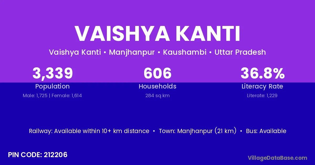Manjhanpur (21 km) is the nearest town to Vaishya Kanti village for major economic activities and is located approximately 21 km away.