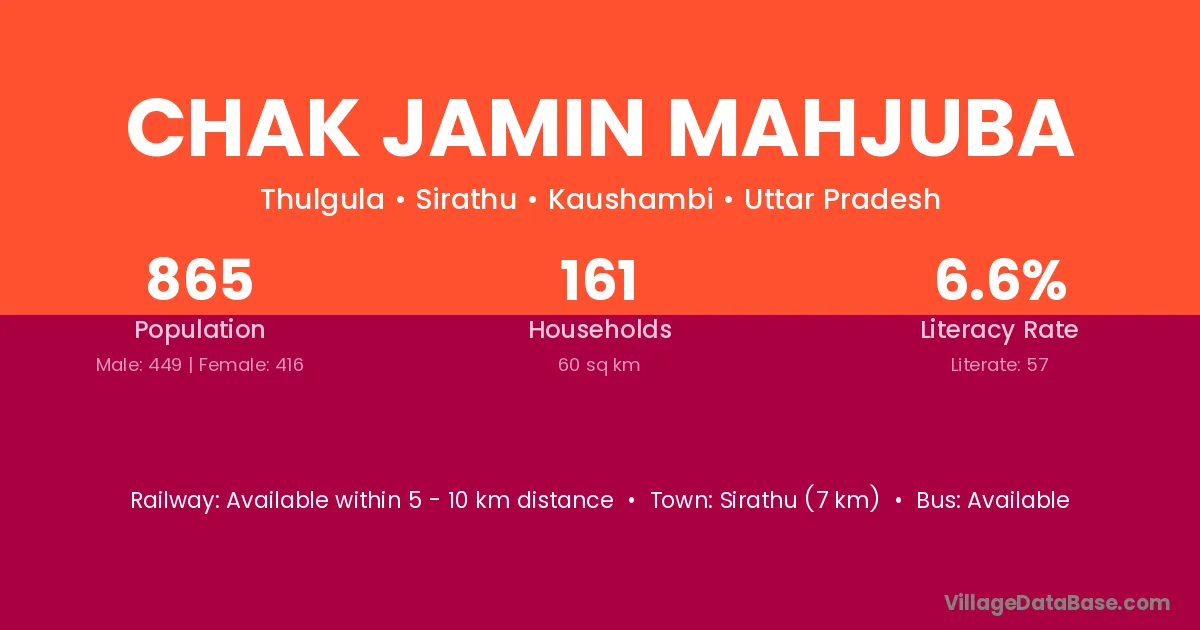 Sirathu (7 km) is the nearest town to Chak Jamin Mahjuba village for major economic activities and is located approximately 7 km away.