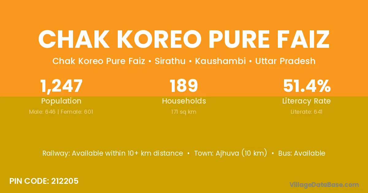 Chak Koreo Pure Faiz village has a total population of 1,247 people, of which 646 are males and 601 are females.
