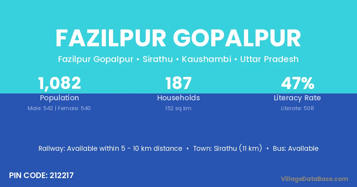 Sirathu (11 km) is the nearest town to Fazilpur Gopalpur village for major economic activities and is located approximately 11 km away.