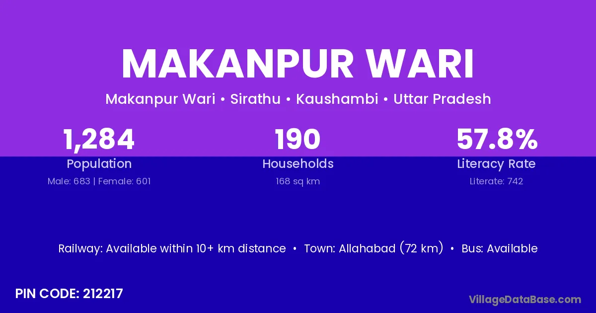 Allahabad (72 km) is the nearest town to Makanpur Wari village for major economic activities and is located approximately 72 km away.