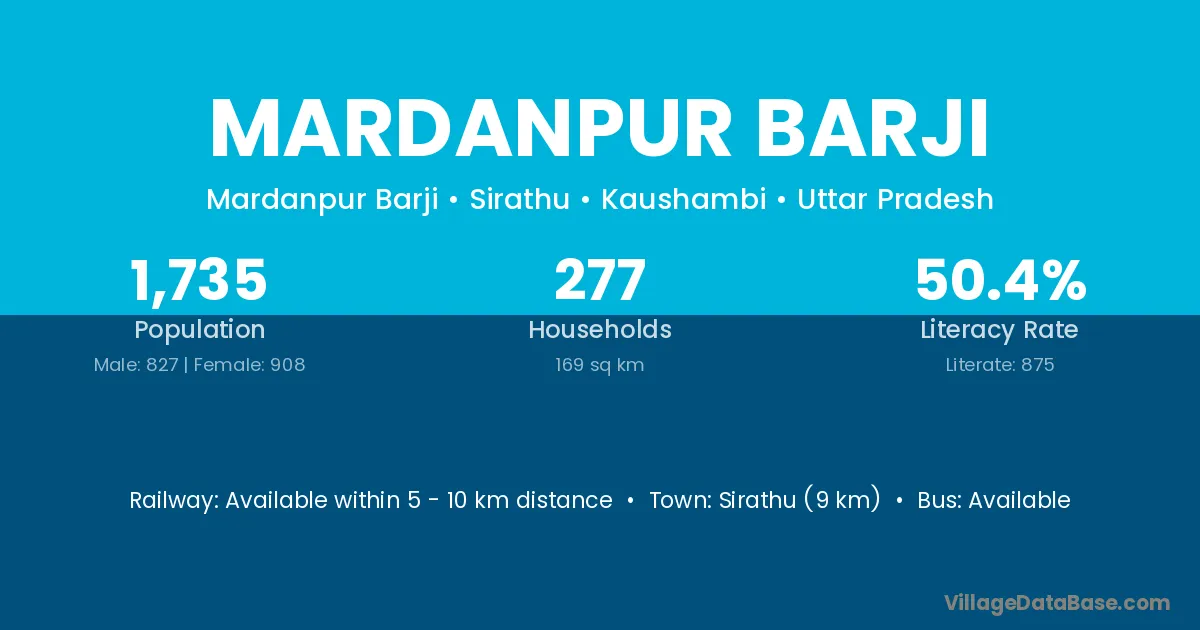 Sirathu (9 km) is the nearest town to Mardanpur Barji village for major economic activities and is located approximately 9 km away.