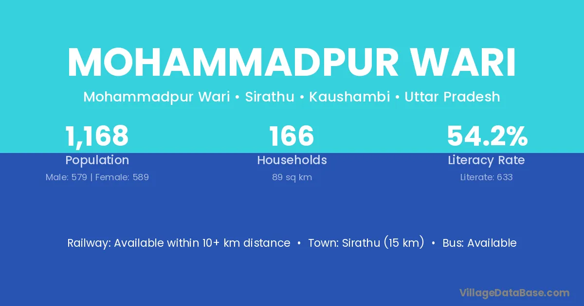 Sirathu (15 km) is the nearest town to Mohammadpur Wari village for major economic activities and is located approximately 15 km away.