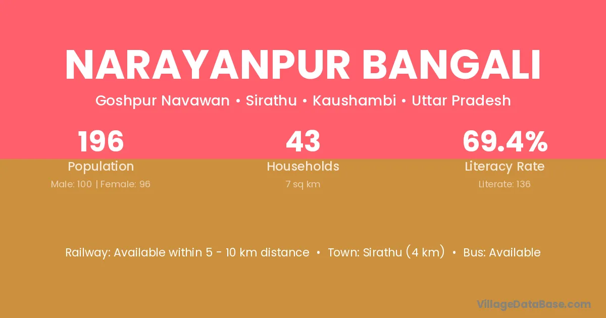 Sirathu (4 km) is the nearest town to Narayanpur Bangali village for major economic activities and is located approximately 4 km away.