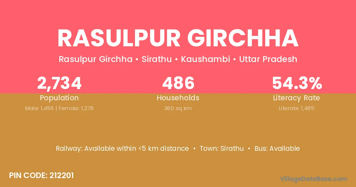 Rasulpur Girchha village has a total population of 2,734 people, of which 1,456 are males and 1,278 are females.