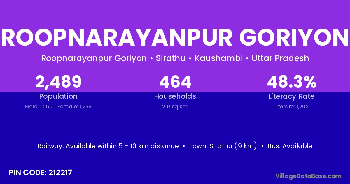 Roopnarayanpur Goriyon village has a total population of 2,489 people, of which 1,250 are males and 1,239 are females.