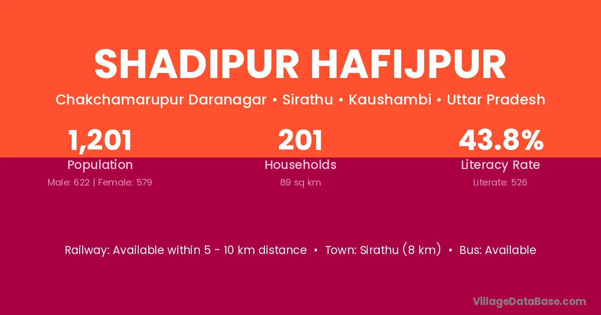 Sirathu (8 km) is the nearest town to Shadipur Hafijpur village for major economic activities and is located approximately 8 km away.