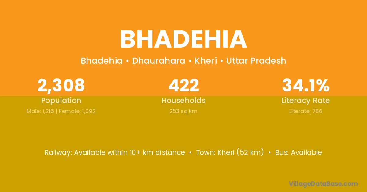 Kheri (52 km) is the nearest town to Bhadehia village for major economic activities and is located approximately 52 km away.
