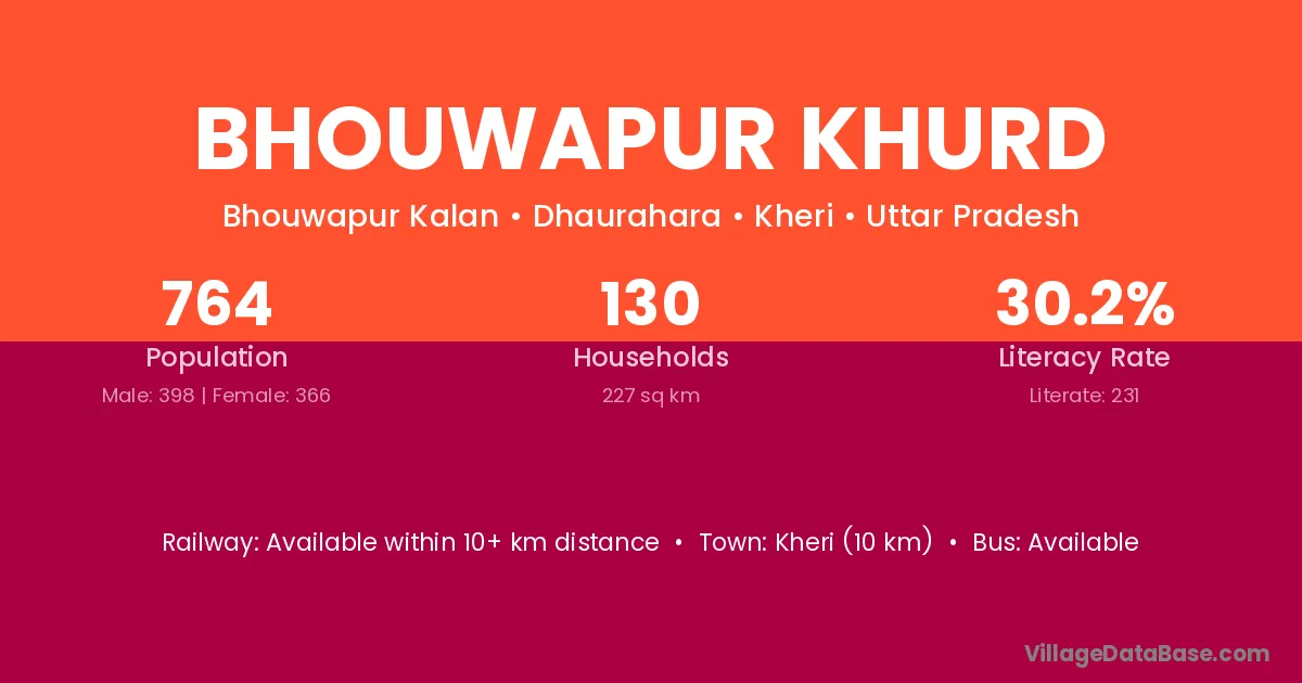 Kheri (10 km) is the nearest town to Bhouwapur Khurd village for major economic activities and is located approximately 10 km away.
