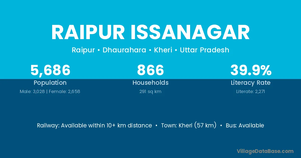 Kheri (57 km) is the nearest town to Raipur Issanagar village for major economic activities and is located approximately 57 km away.