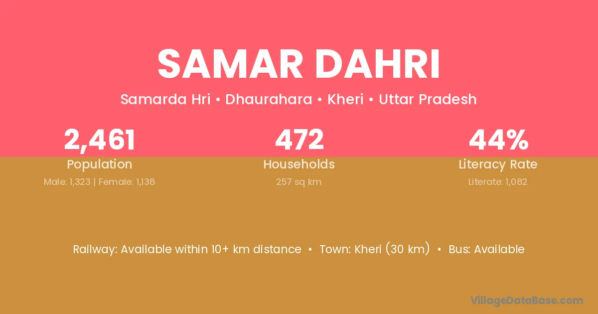 Kheri (30 km) is the nearest town to Samar Dahri village for major economic activities and is located approximately 30 km away.