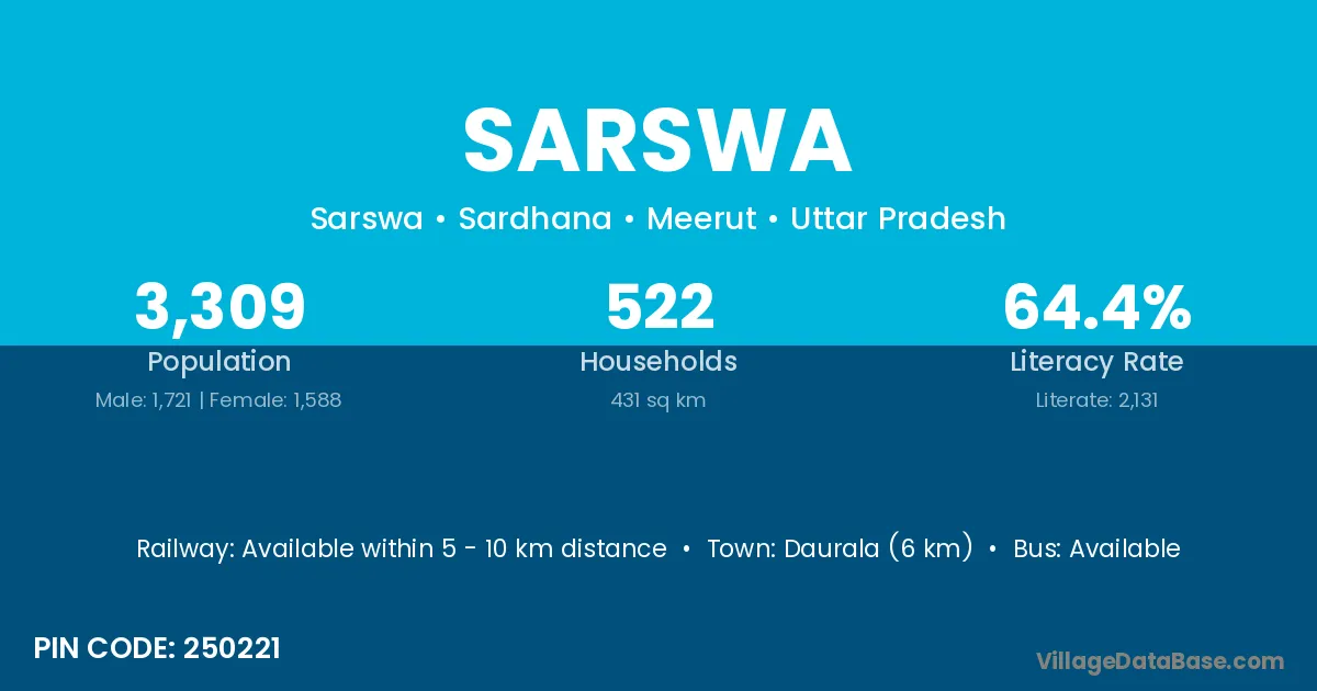Kheri (15 km) is the nearest town to Sarswa village for major economic activities and is located approximately 15 km away.