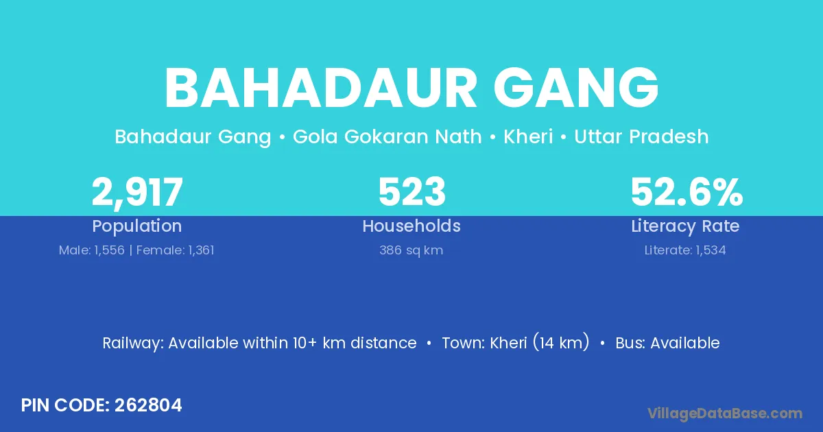 Kheri (14 km) is the nearest town to Bahadaur Gang village for major economic activities and is located approximately 14 km away.
