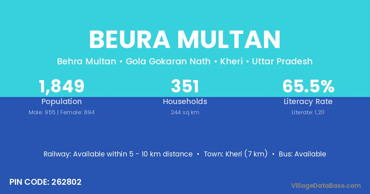 Kheri (7 km) is the nearest town to Beura Multan village for major economic activities and is located approximately 7 km away.