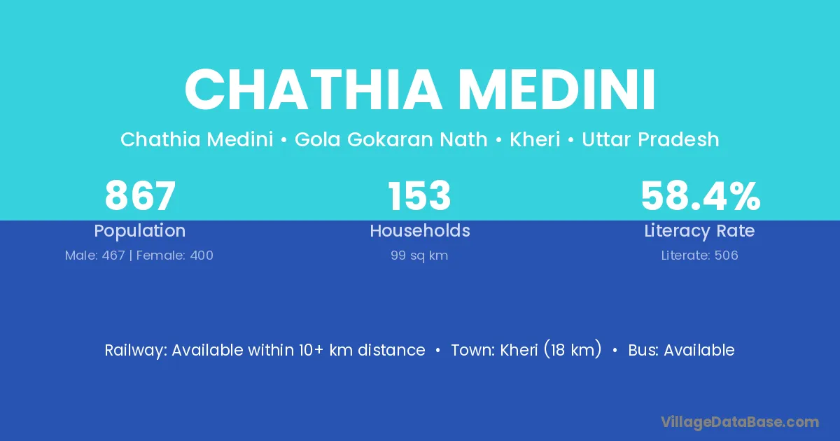 Kheri (18 km) is the nearest town to Chathia Medini village for major economic activities and is located approximately 18 km away.