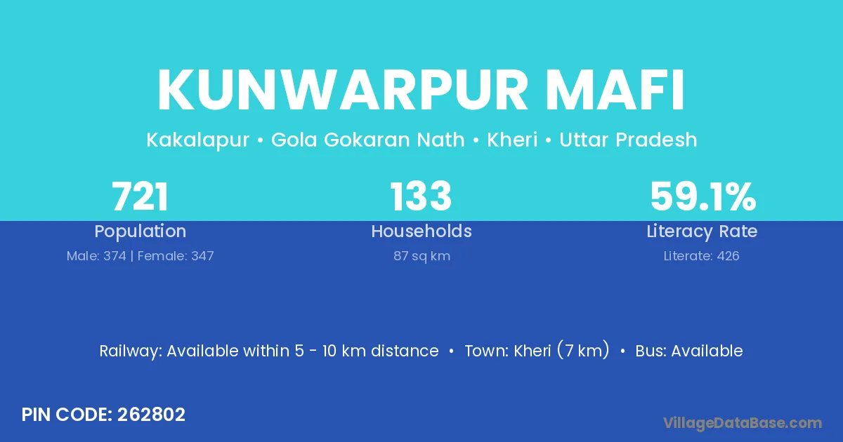 Kheri (7 km) is the nearest town to Kunwarpur Mafi village for major economic activities and is located approximately 7 km away.