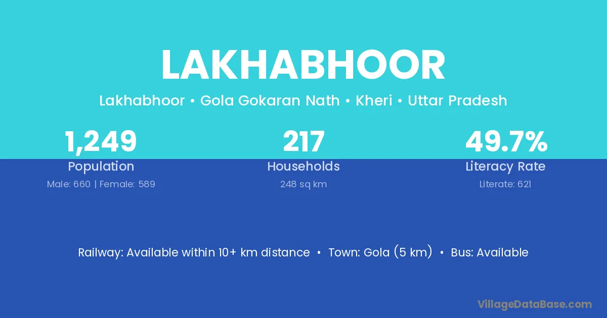 Lakhabhoor village has a total population of 1,249 people, of which 660 are males and 589 are females.