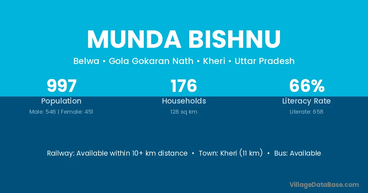 Kheri (11 km) is the nearest town to Munda Bishnu village for major economic activities and is located approximately 11 km away.