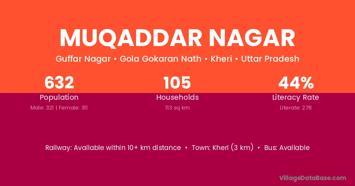 Kheri (3 km) is the nearest town to Muqaddar Nagar village for major economic activities and is located approximately 3 km away.