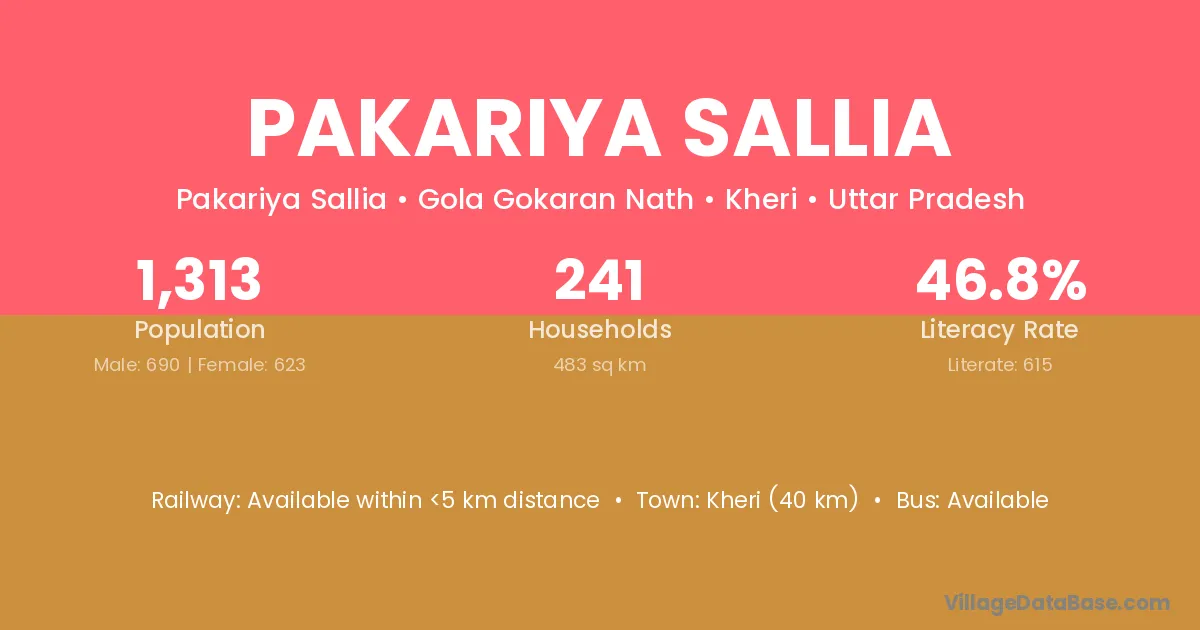 Kheri (40 km) is the nearest town to Pakariya Sallia village for major economic activities and is located approximately 40 km away.