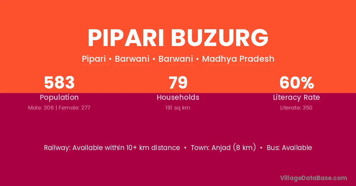 Kheri (5 km) is the nearest town to Pipari Buzurg village for major economic activities and is located approximately 5 km away.