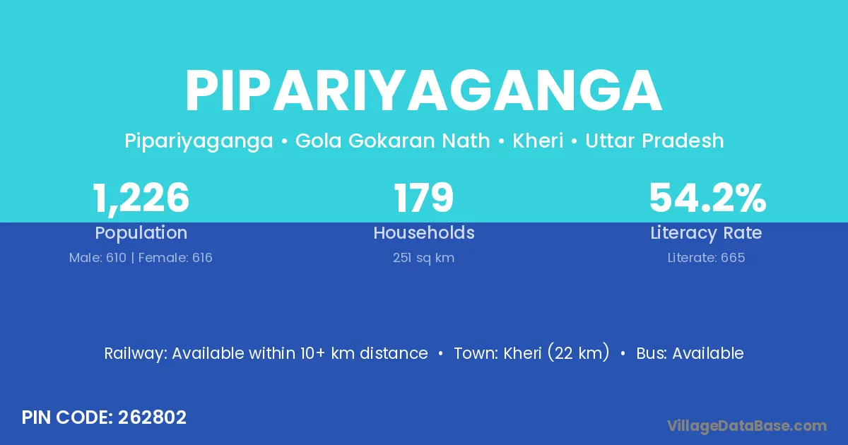 Kheri (22 km) is the nearest town to Pipariyaganga village for major economic activities and is located approximately 22 km away.