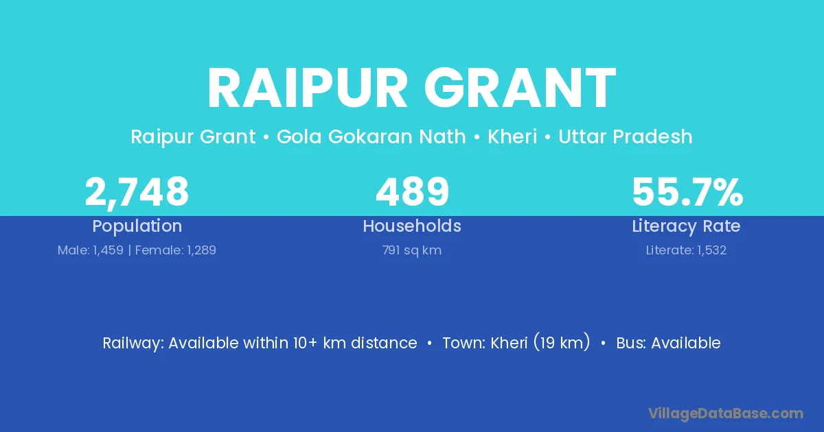 Kheri (19 km) is the nearest town to Raipur Grant village for major economic activities and is located approximately 19 km away.