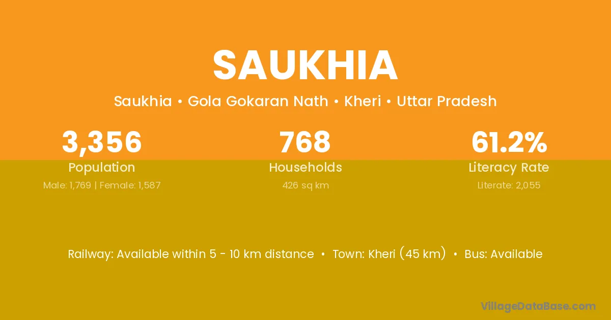 Kheri (45 km) is the nearest town to Saukhia village for major economic activities and is located approximately 45 km away.