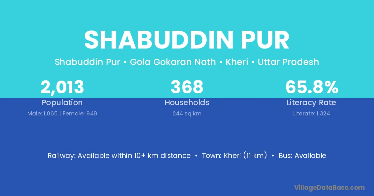 Kheri (11 km) is the nearest town to Shabuddin Pur village for major economic activities and is located approximately 11 km away.