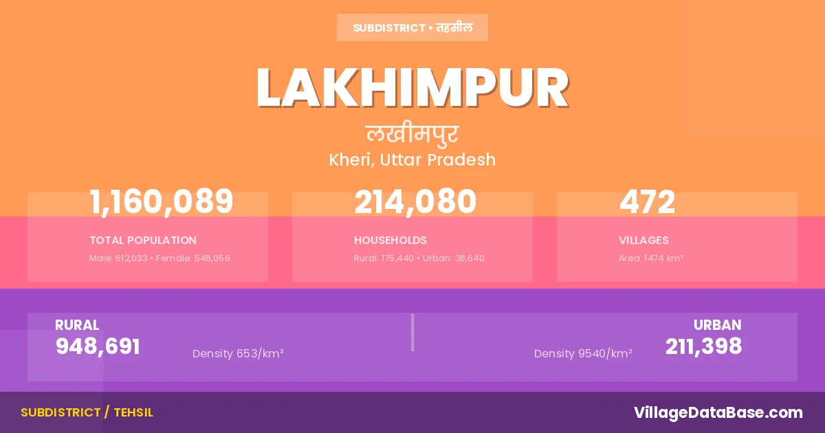 According to the 2011 census The total area of Lakhimpur Tehsil is 1474 km², with a population of 1160089 people. The population density is 787 inhabitants per square kilometre, and there are approximately 214080 houses in the sub district.