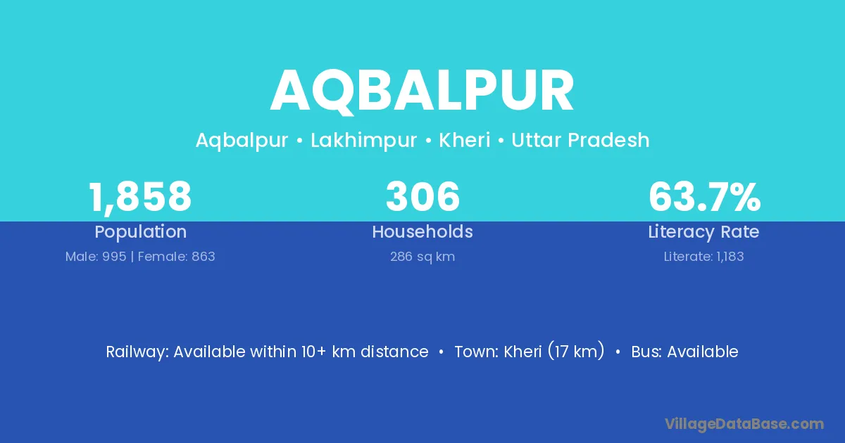 Kheri (17 km) is the nearest town to Aqbalpur village for major economic activities and is located approximately 17 km away.