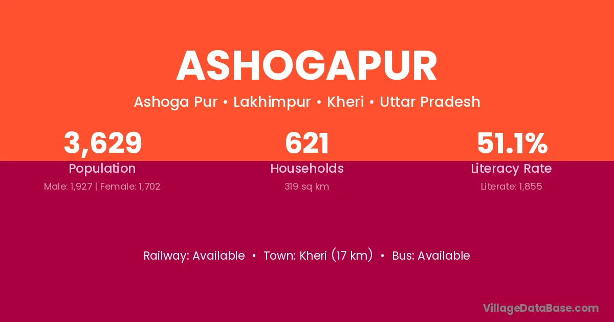 Kheri (17 km) is the nearest town to Ashogapur village for major economic activities and is located approximately 17 km away.